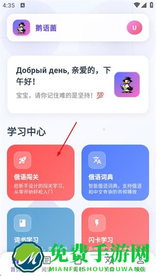 1、在鹅语菌首页,点击俄语闯关选项,进入俄语闯关页面。