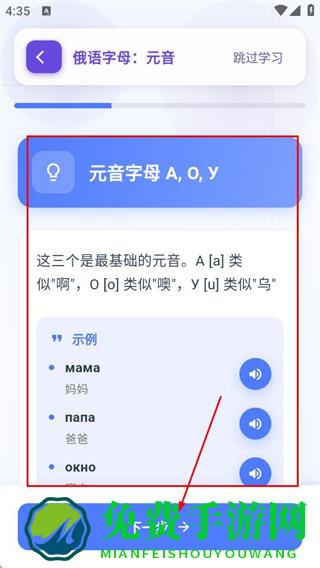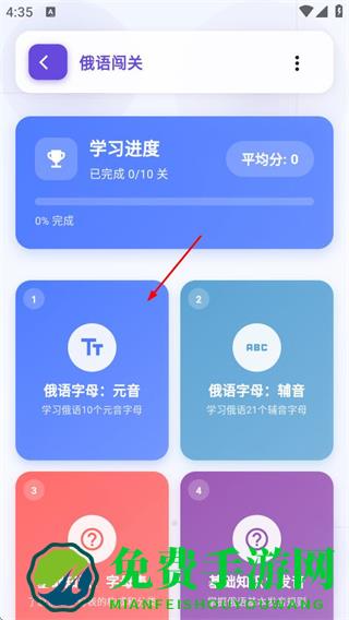 2、在俄语闯关页面,选择要学习的关卡,进入学习页面。