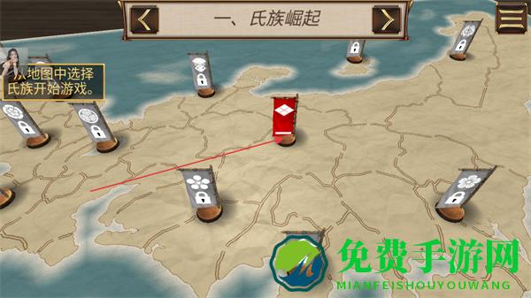 1、在地图中选择氏族开始游戏,如氏族崛起阶段选择红色旗帜标识的氏族。