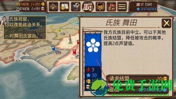 2、点击外交关系,可查看氏族间的外交状态,如远江县处于舞田氏族统治之下。