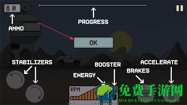 1、熟悉界面功能,如弹药AMMO、稳定器STABILIZERS等,点击OK开始游戏。