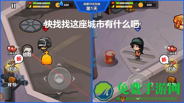 1、在城市中探索,拾取物资如装备、金币,点击拾取按钮收集资源,为生存和战斗做准备。
