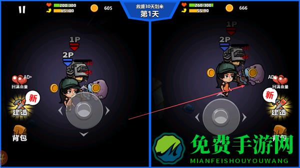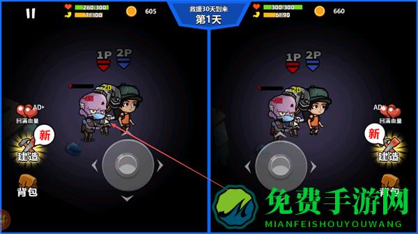 2、夜晚会遭遇丧尸攻击,与队友2P协同作战,共同消灭丧尸,注意躲避攻击,保持自身血量。