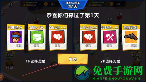 4、成功撑过一天后,可选择奖励如血量提升、武器耐久增加等,点击继续进入下一天,持续生存下去,完成我撑30天到来的挑战。