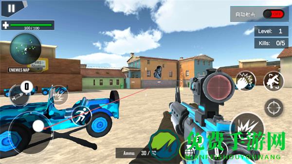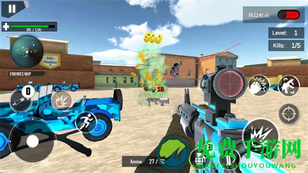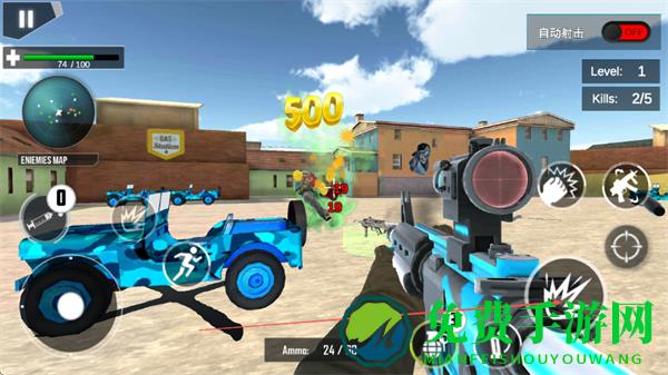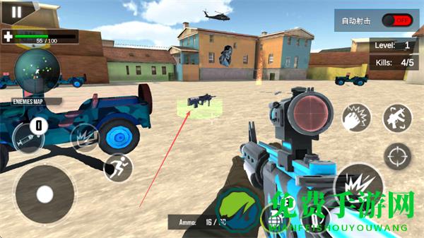 1、通过左侧虚拟摇杆控制移动,右侧瞄准射击,利用枪械瞄准敌方目标,精准射击消灭敌人。