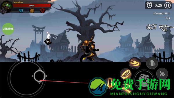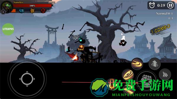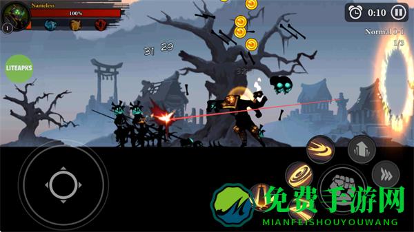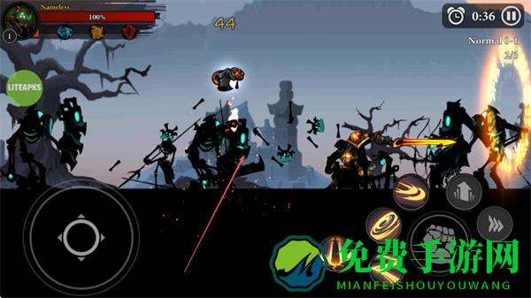 1、通过左侧虚拟摇杆控制火柴人移动,右侧按键执行攻击、技能释放等操作,在关卡中与敌人战斗。
