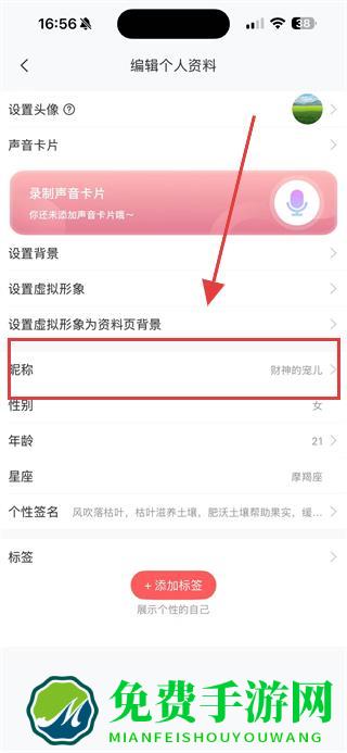 3、在编辑个人资料界面中点击昵称,进入昵称设置页面。
