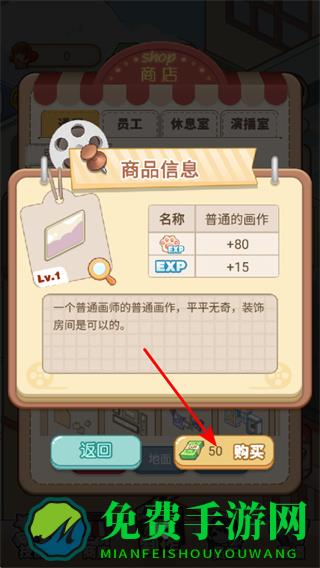 3、进入商店界面后,点击如普通的画作之类的装饰道具,可查看其属性和功能,是提升店铺装饰等级关键操作。