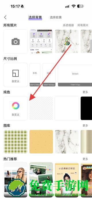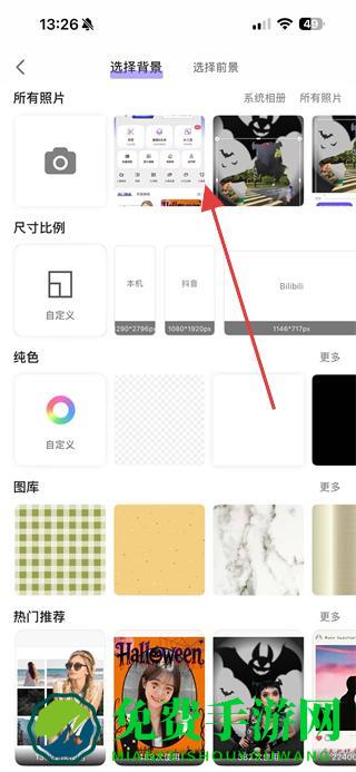 2、在背景选择页面选择想要的背景样式可从纯色、图库、热门推荐等分类中选择。