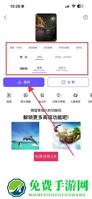 4、在保存设置页面选择格式、清晰度等参数后,点击保存,即可完成图片的导出操作。