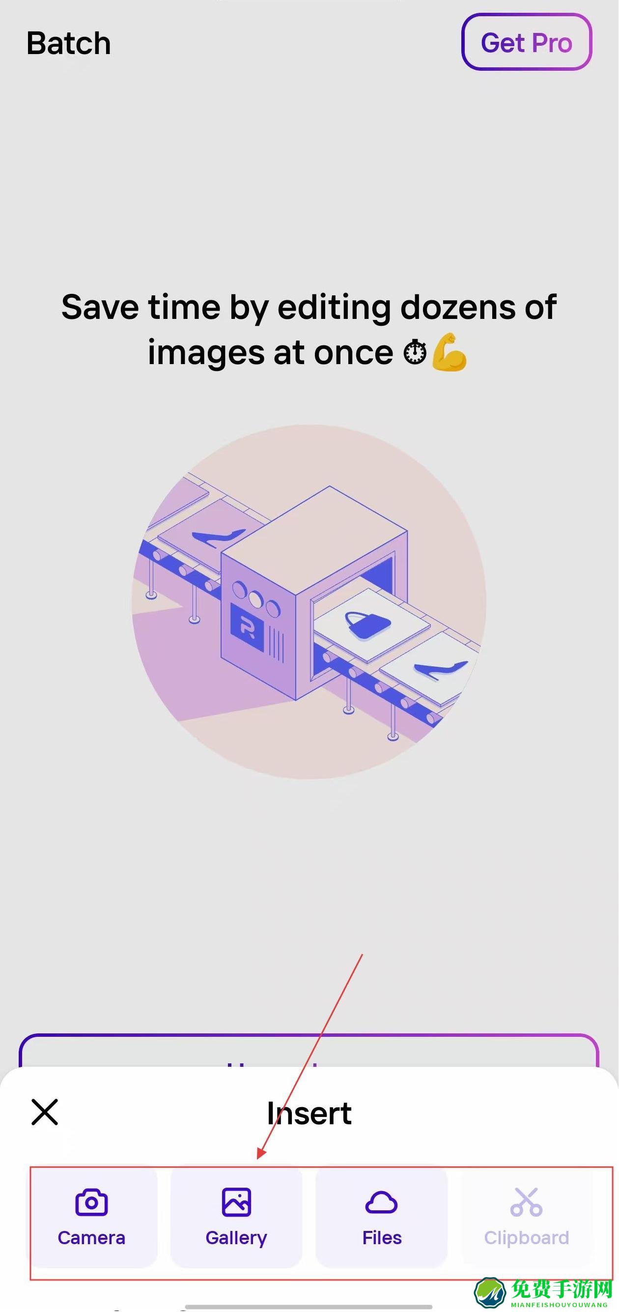 2、在弹出的Insert选项栏中,选择Gallery,从手机相册中选取需要批量处理的图片。