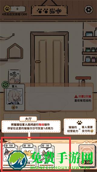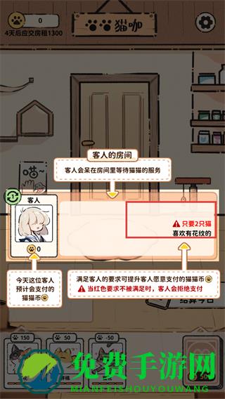 2、客人进入房间后,需满足其红色要求,若不满足客人会拒绝支付,满足则可提升客人愿意支付的猫猫币。