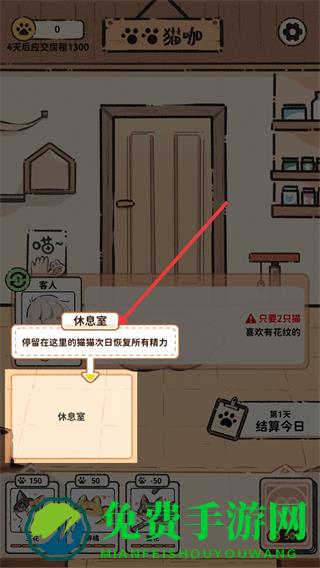 3、当猫咪精力不足时,可将其拖入休息室,停留在休息室的猫咪次日恢复所有精力,以保证后续服务的能力。