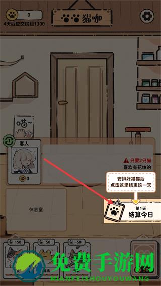 4、安排好猫咪服务客人后,点击结算今日按钮,即可结束这一天的经营,进入次日继续管理猫咖。