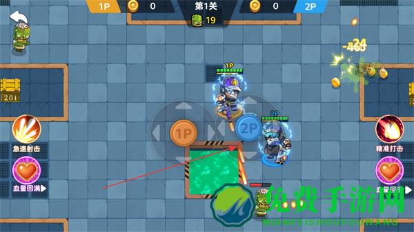 1、玩家11P和玩家22P分别通过各自的虚拟摇杆控制角色移动,在场景中躲避僵尸攻击并发起反击。