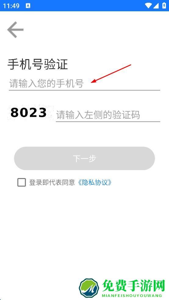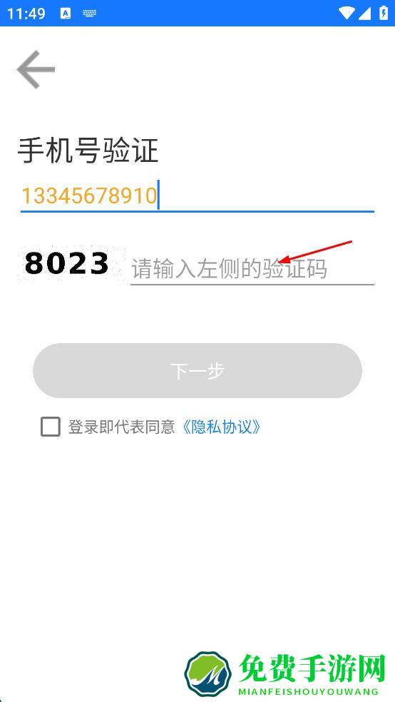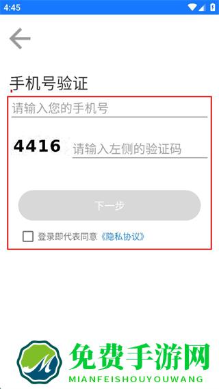 2、在手机号验证界面输入手机号码和验证码,勾选登录即代表同意隐私协议,点击下一步。
