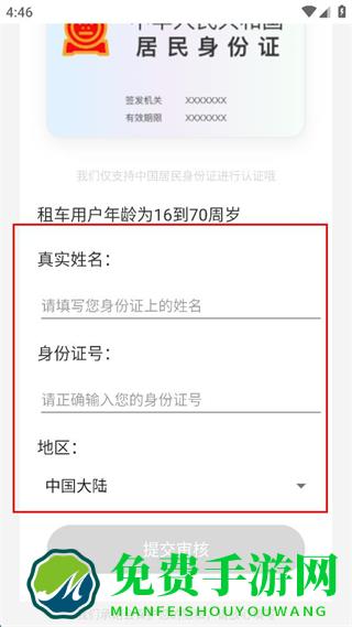 4、在实名认证界面输入真实姓名、身份证号,选择地区,点击提交审核。