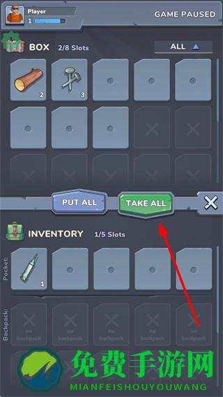 4、搜索到的资源与物品,点击TAKE ALL可快速将收集的资源放入背包,合理分配背包空间,优先携带制作关键装备的材料。