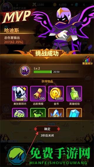 4、击败破坏神后,获得挑战成功,点击确定领取奖励,包括英雄经验、金币等,提升英雄战力继续挑战。