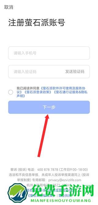 3、进入注册萤石派账号页面,输入手机号、验证码后,点击下一步。