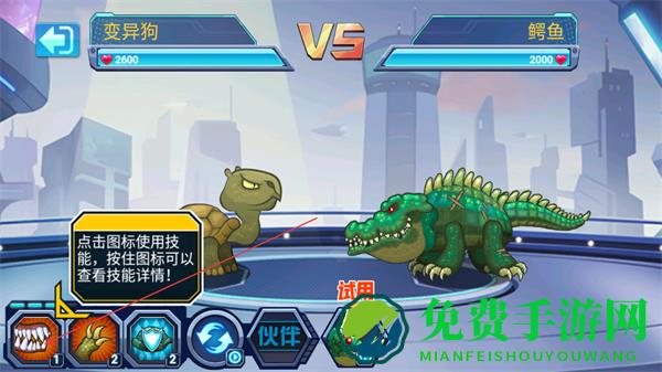 1、点击技能图标使用技能,按住可查看技能详情,对战鳄鱼时选择合适技能发起攻击。
