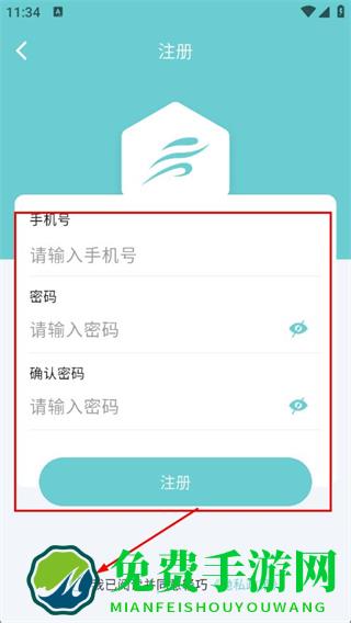 2、输入手机号、密码,确认密码,勾选同意隐私政策,点击注册。