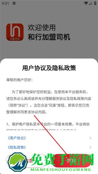 1、打开和行加盟司机,在弹出的提示框中点击同意。