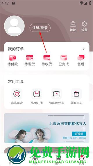 2、在个人页面,点击注册登录选项,进入登录页面。