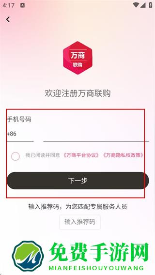 4、在注册页面,输入手机号码,勾选协议后点击下一步。