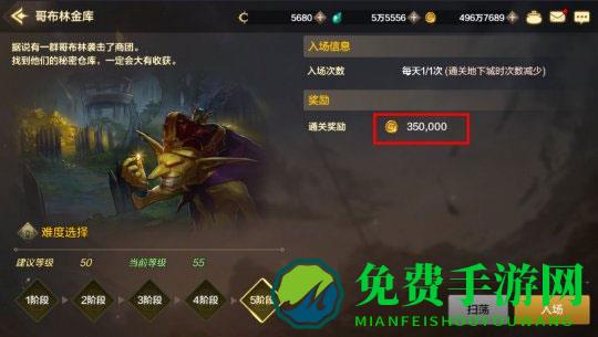 50级之后可以进入哥布林金库,每个号每天可以刷35万金币。