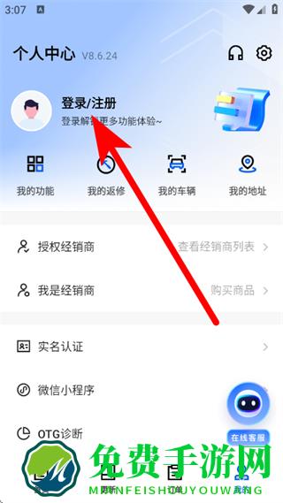 2、在个人中心页面中,点击登录注册,进入注册页面。