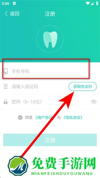 3、在注册页面,输入手机号码后,点击获取验证码。