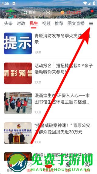 1、打开美丽青原,在首页点击右上角三横线图标,进入频道管理。