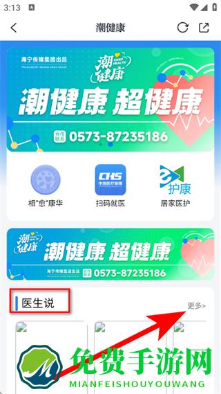 3、在潮健康页面,找到医生说板块,点击右侧的更多。