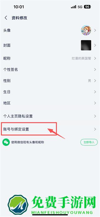 3、在资料修改页面,点击账号与绑定设置选项,进入账号管理页面。