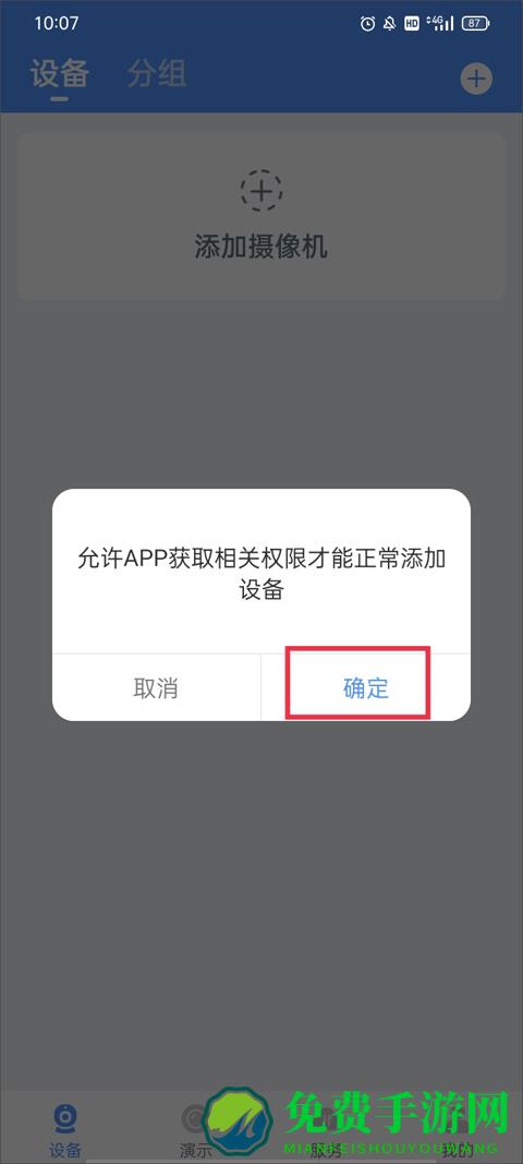 2、页面弹出一个提示:允许APP获取相关权限才能正常添加设备,点击确定。