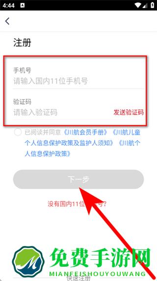 4、输入手机号,输入验证码后,勾选已阅读并同意相关协议,点击下一步,完成注册。