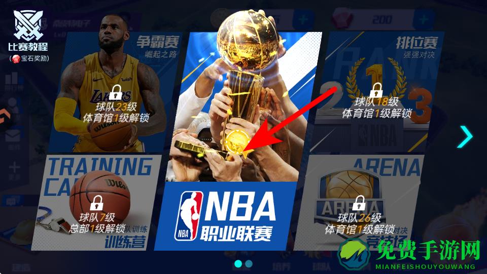 2、在比赛选择界面,选择可参与的赛事如NBA职业联赛,点击进入赛事准备界面。