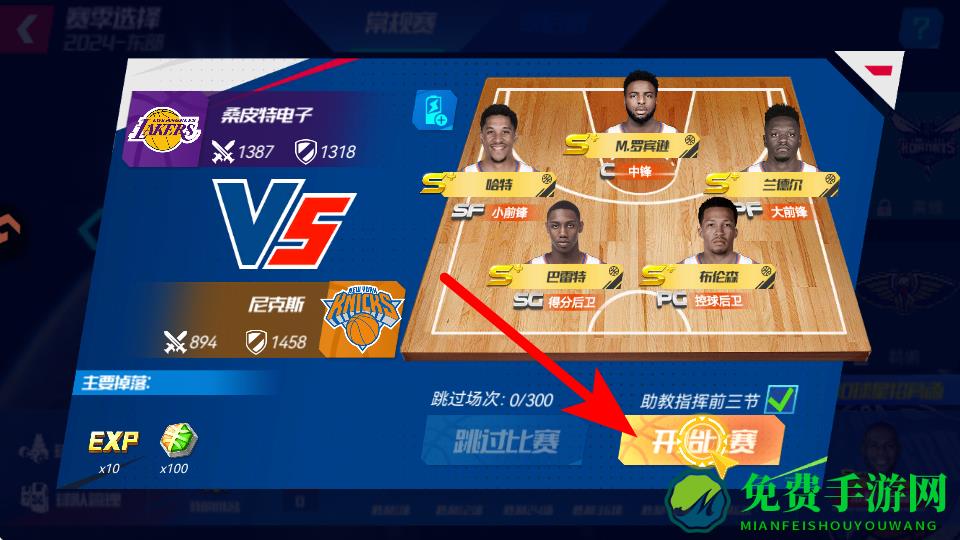 4、在比赛对战界面,可观察球员在球场上的实时表现,通过操作球员传球、投篮、防守等,参与比赛并争取胜利,同时可获得经验、道具等奖励。