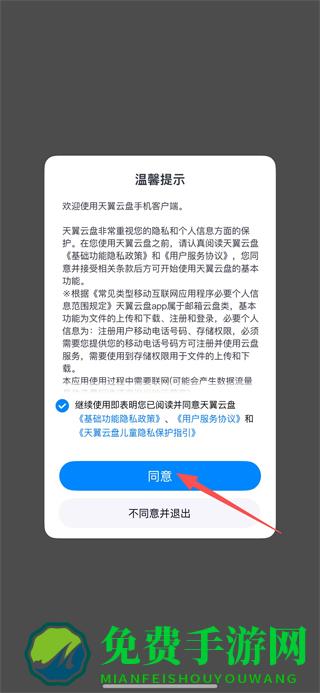 1、在天翼云盘温馨提示弹窗中,点击同意,进入登录选择页面。