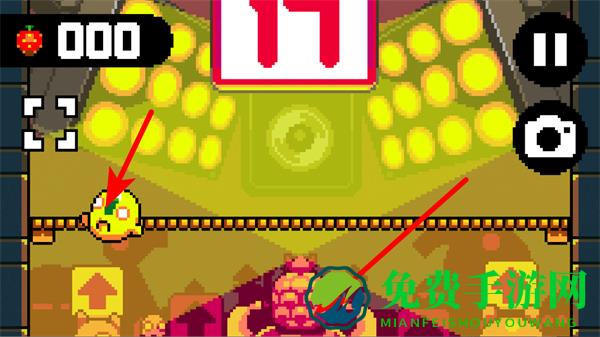 2、在游戏界面,操控黄色角色躲避障碍,同时注意下方的怪物。