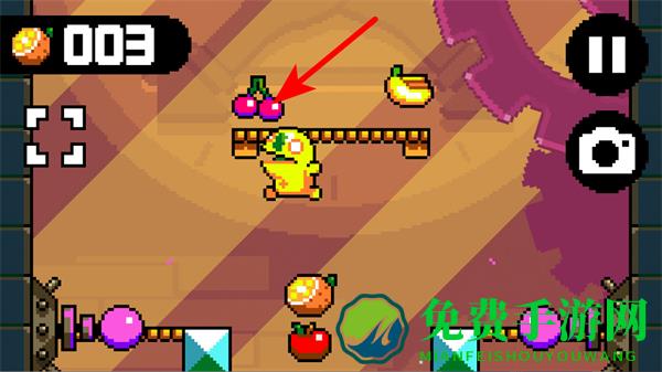 3、在游戏过程中,角色可借助道具前进,收集上方的水果等物品。