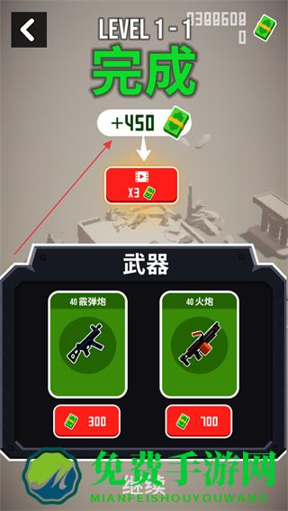 4、成功消灭所有敌人后,完成LEVEL1-1关卡,领取450金币奖励,可选择解锁新武器,点击继续进入下一关。