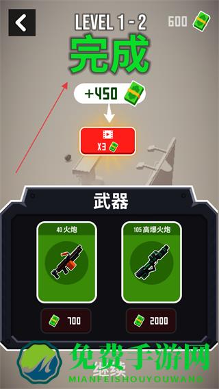 4、成功消灭所有敌方单位后,完成关卡,领取金币奖励,可选择解锁新武器,继续挑战下一关。