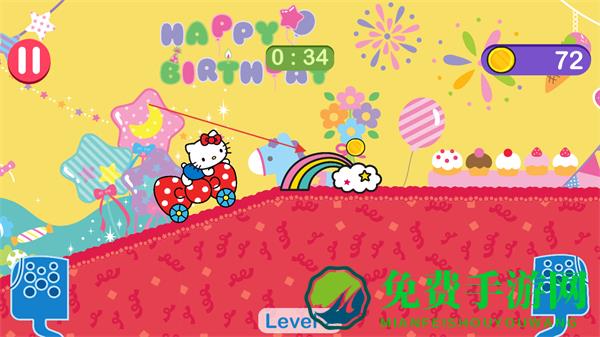 1、在Level2跑道上,驾驶凯蒂猫小车收集金币,利用彩虹道具获取额外金币。