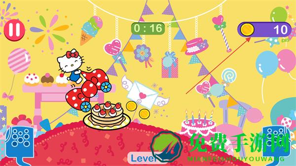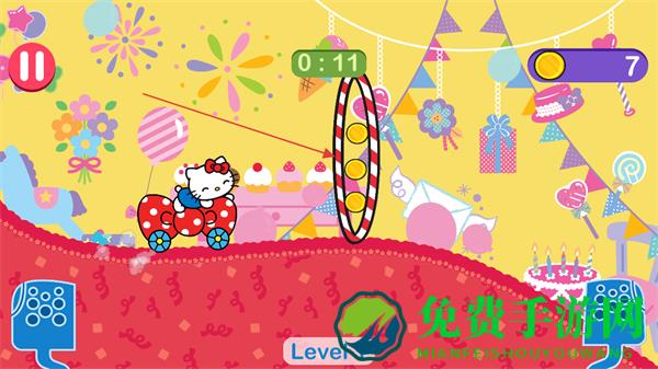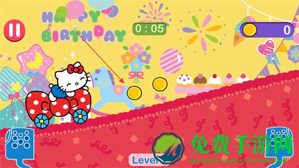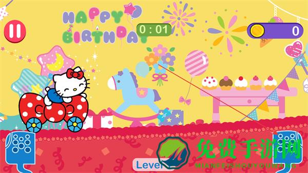 1、操控凯蒂猫驾驶小车在生日主题跑道上行驶,注意时间限制,收集金币。