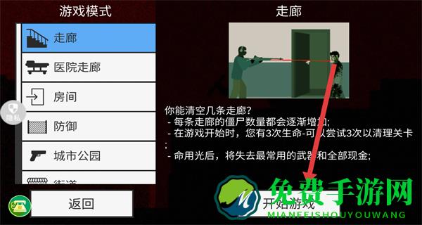 2、在游戏模式选择界面,选择游戏模式“走廊”后,点击开始游戏按钮。