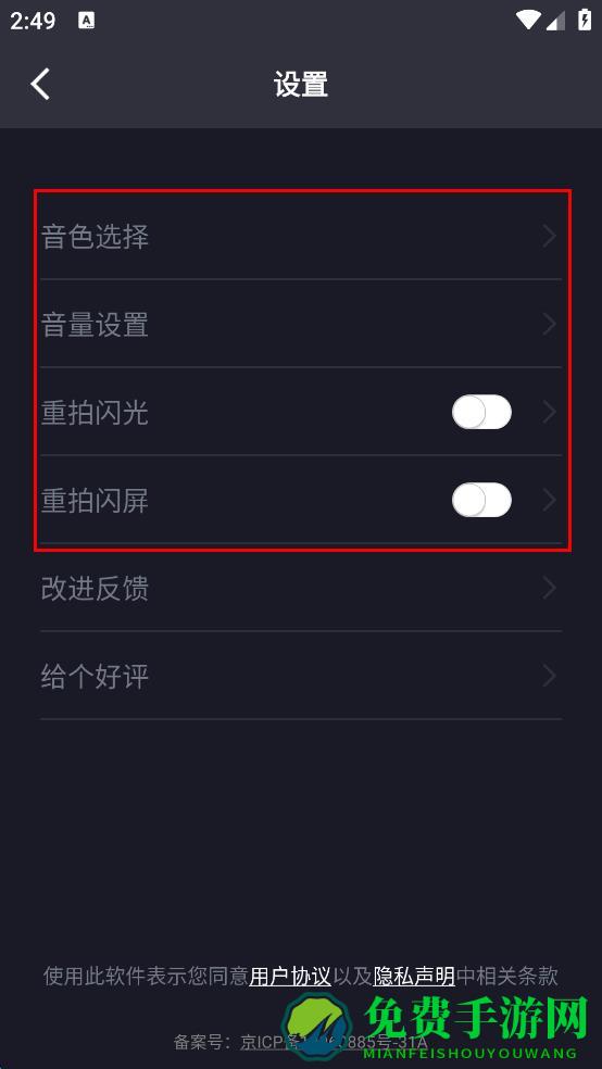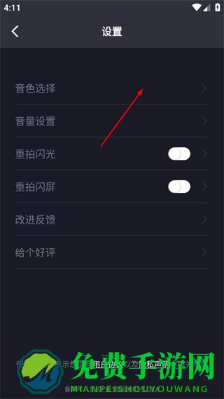 2、在设置页面可进行音色选择、音量设置,还可开启重拍闪光和重拍闪屏功能。