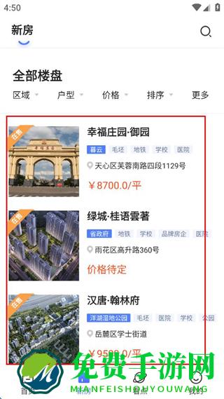 4、在新房界面可查看全部楼盘信息,如幸福庄园御园等楼盘的区域、价格等内容。