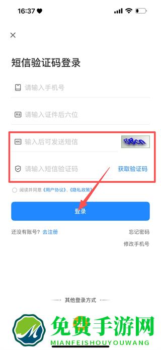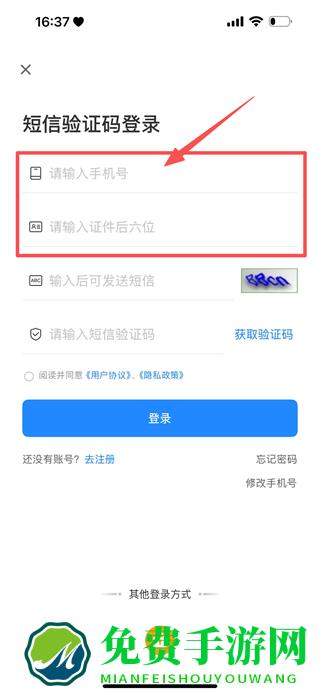 3、在短信验证码登录页面,输入手机号和证件后六位。